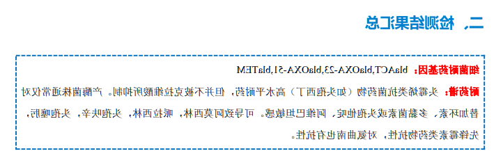 结果提示对头霉烯类抗菌药物(如头孢西丁)高水平耐药,但并不被克拉维酸所抑制。产酶菌株通常仅对替加环素、多黏菌素或头孢他啶、阿维巴坦敏感。可导致阿莫西林,哌拉西林,头孢呋辛,头孢噻肟,先锋霉素类药物抗性,对氨曲南也有抗性。