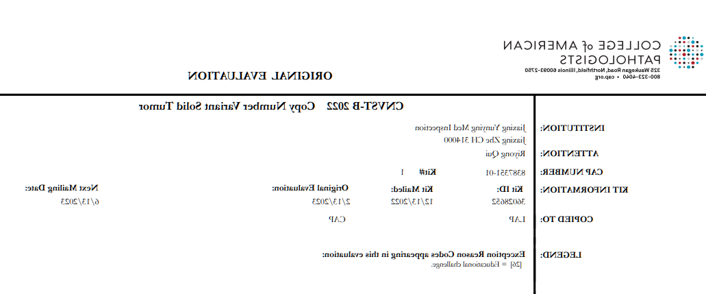 2、本次测评对于各参加单位给出一个数字代码,该代码对应的是“参评单位对于本次检测项目需要采取的后续行动”。杏彩体育旗舰厅 本次获得的测评结果代码为“26”,代表“后续无需向CAP进行任何反馈,仅需参考评估汇总报告对自己的检测结果进行重复,并记录”。