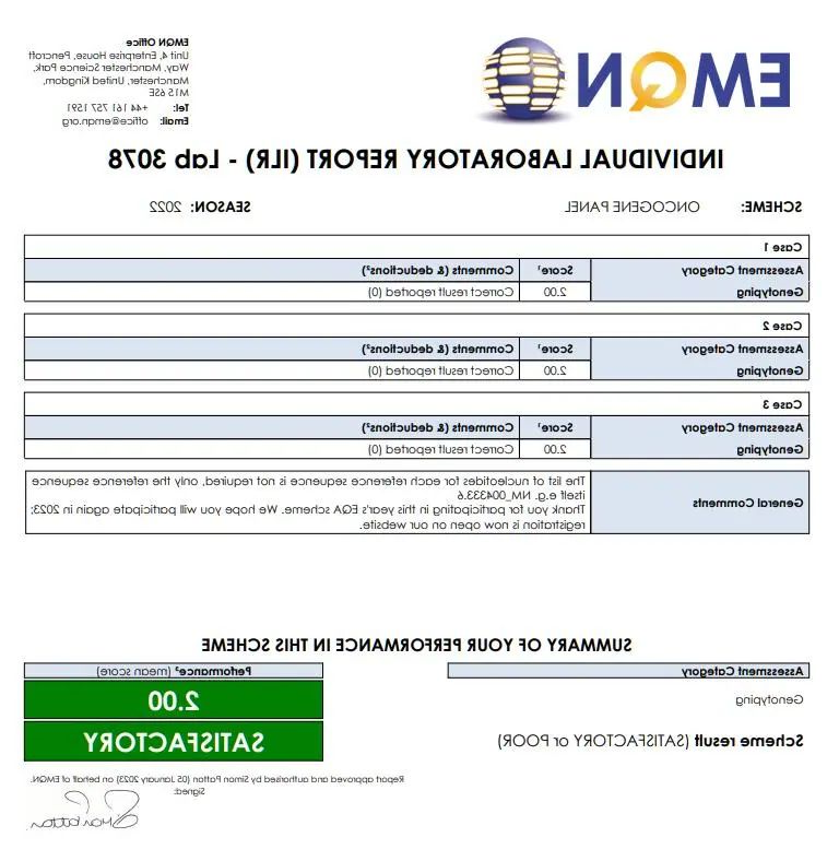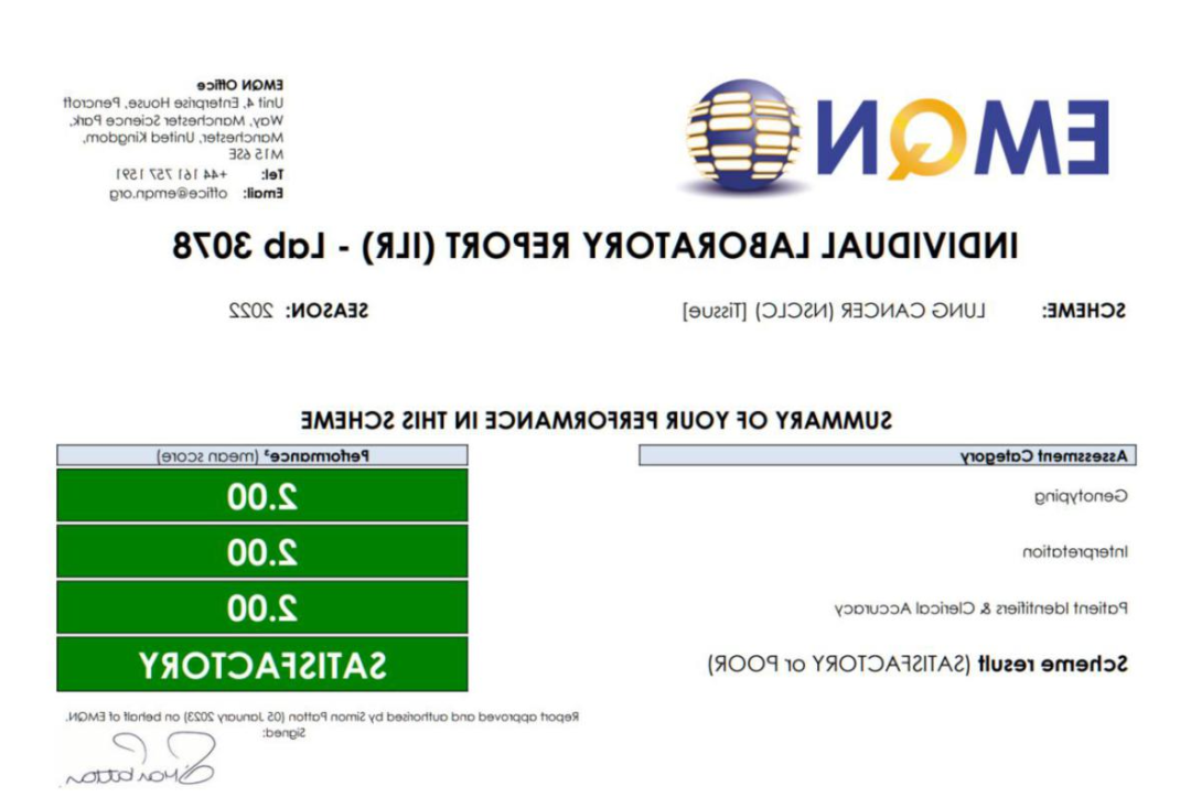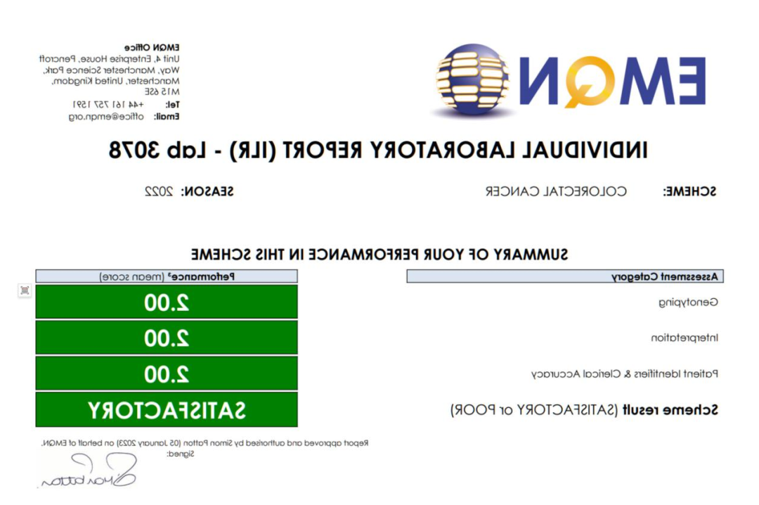 近日,EMQN(欧洲分子基因诊断质量联盟)公布了2022年度“Oncogene Panel”、“Lung Cancer (NSCLC)[Tissue]”和“Colorectal Cancer”三项室间质评考核结果。杏彩体育旗舰厅 参与此次三个项目的室间质评并以满分通过,又一次充分印证杏彩体育旗舰厅 从基因检测、生信分析到报告解读各个环节的准确性、规范性及稳定性均处于国际领先水平!