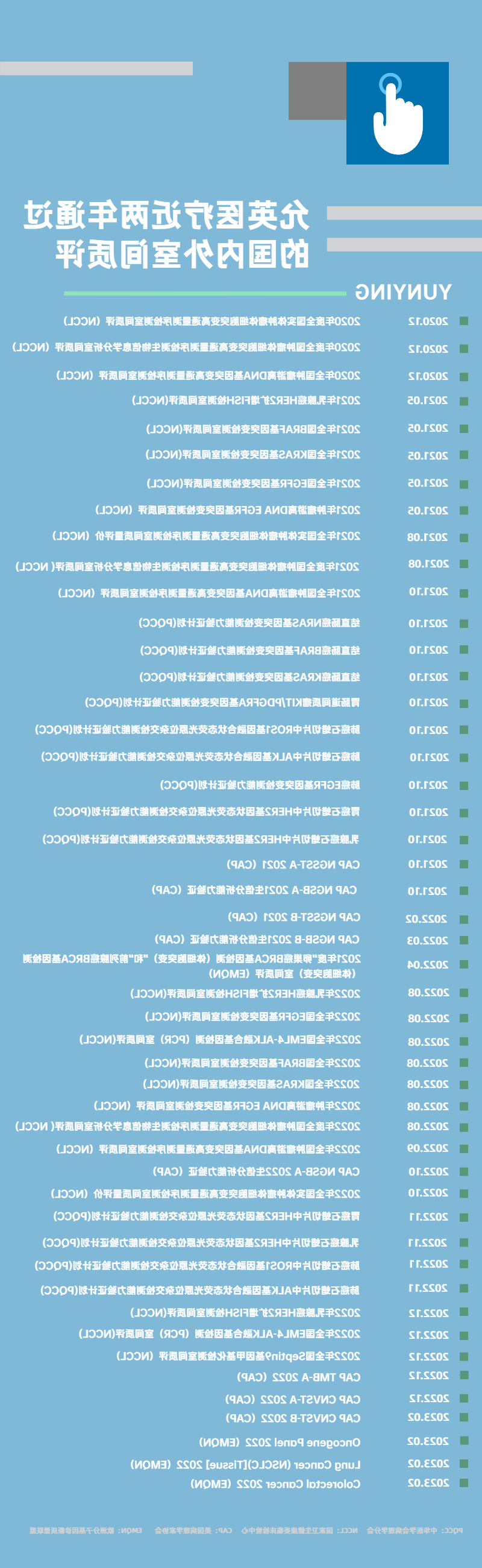 成立至今,顺利通过由国家卫健委临检中心、国家病理质控中心、美国病理学会等机构组织的室间质评。检验能力获得了美国病理学会PT认证、国际ISO13485认证,部分试剂盒通过欧盟CE认证,获得国家药品监督管理局(NMPA)注册批准。目前允英已累计为近三十万例肿瘤患者提供精准检测服务,为国内肿瘤精准医疗领域开拓者。同时允英秉承“严谨、高效”的理念,坚守分子诊断技术创新与应用探索,为肿瘤精准医疗与伴随诊断领域的茁壮发展贡献力量。