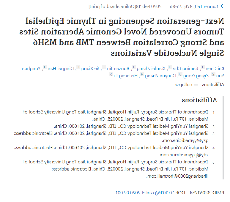 [允英学术成果]NGS检测揭示胸腺肿瘤基因突变特点及MSH6单核苷酸变异与TMB的关系